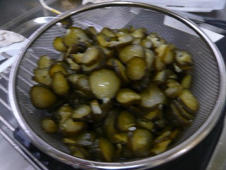 一夜浸けして、絞って絞って、味付けは、みりんと醤油と酢と唐辛子